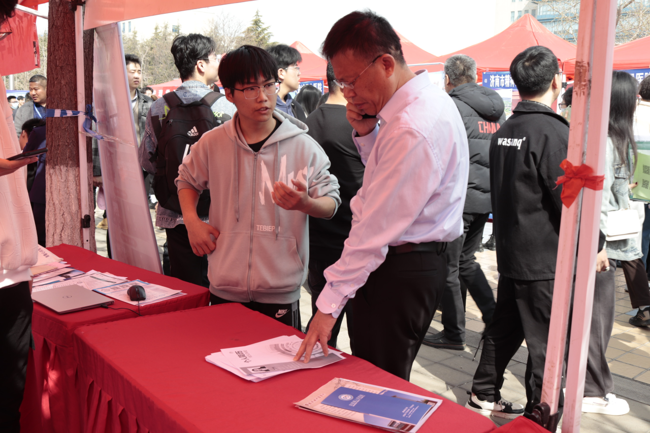 党委副书记张继伟、团总支(学工办)副书记(副主任)郭立伟、副科级辅导员张叶、副科级辅导员宁鲁宁和就业辅导员袁月松也来到了招聘会现场。张继伟与毕业生亲切交流,了解其就业期望,并积极将其向用人单位举荐。同时,张继伟也与现场多家用人单位代表进行了深入交流,了解其招聘情况与人才需求,以促进学校毕业生高质量充分就业。