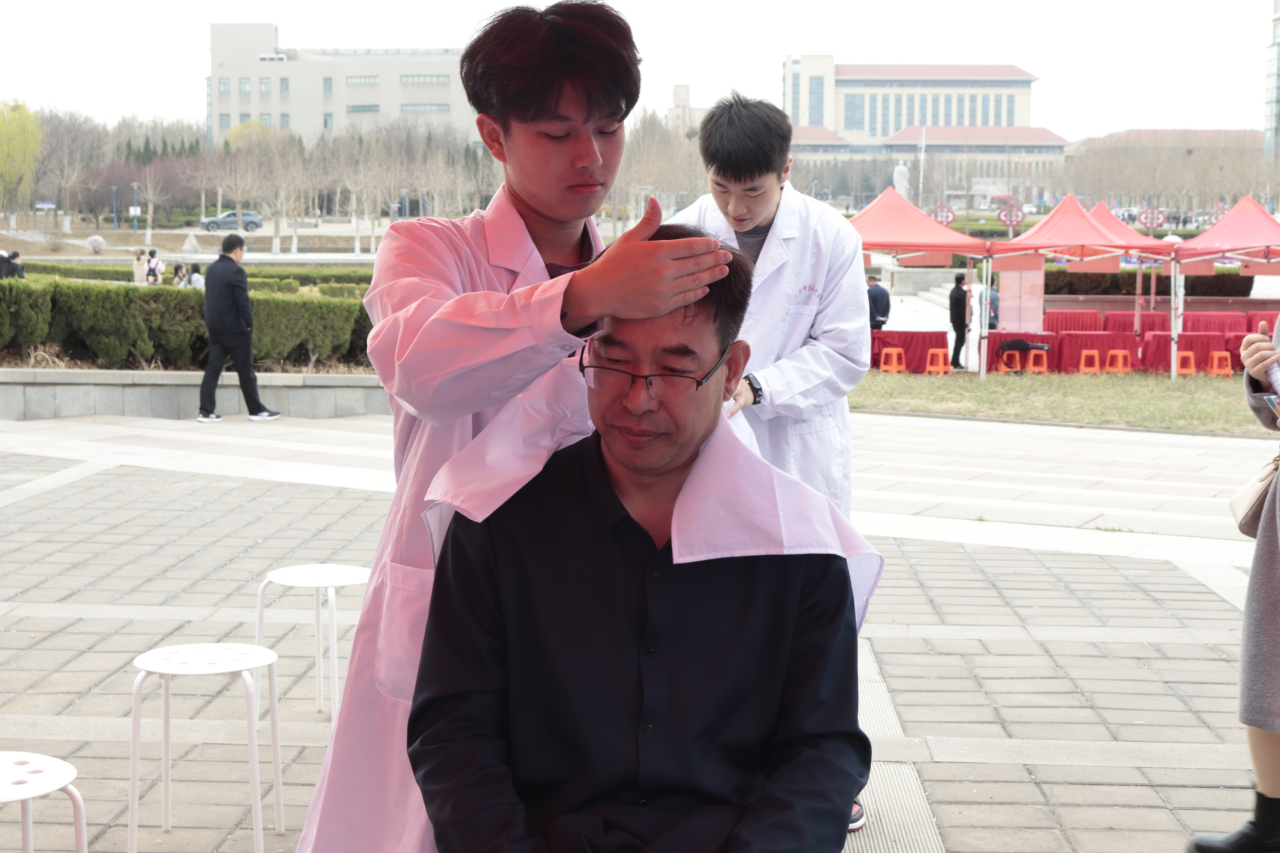 “针心灸行”服务队成员在现场为大家带来了推拿、拔罐、压耳豆等义诊服务。他们以暖心的服务和精湛的技术展示出针推学子的良好风貌。