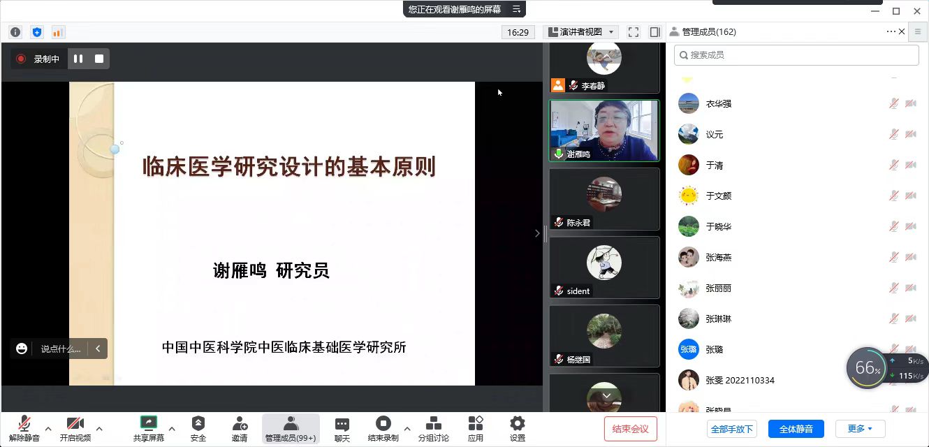 首席研究员、博士生导师、岐黄学者谢雁鸣研究员,面向针推专业的教师和硕博士进行了题为《临床医学研究设计的基本原则》的科研讲座。