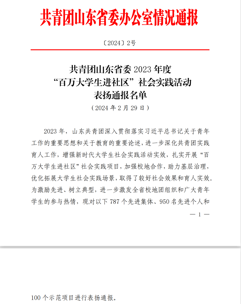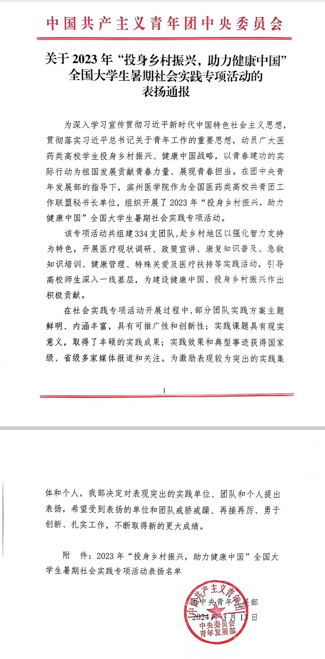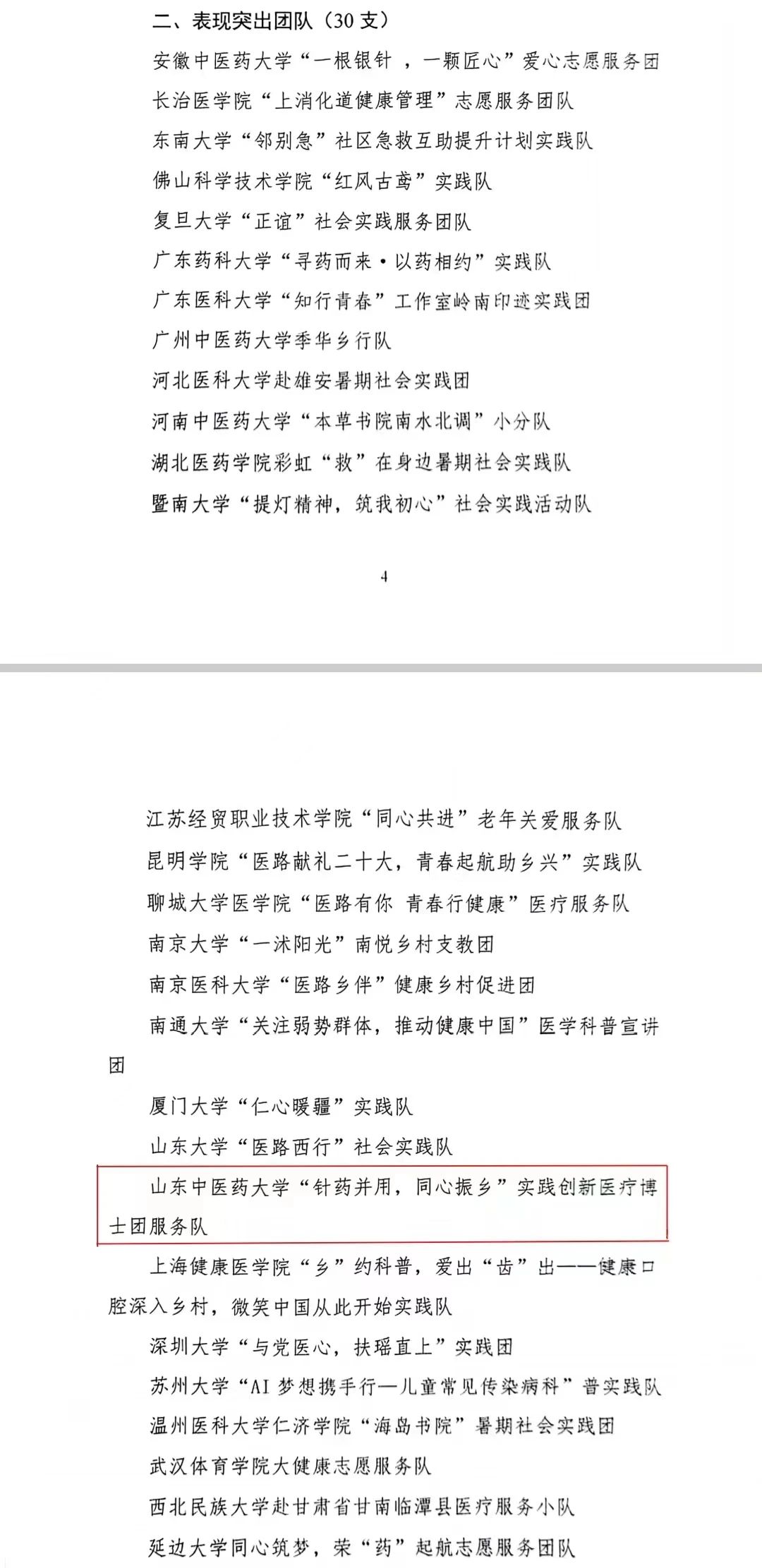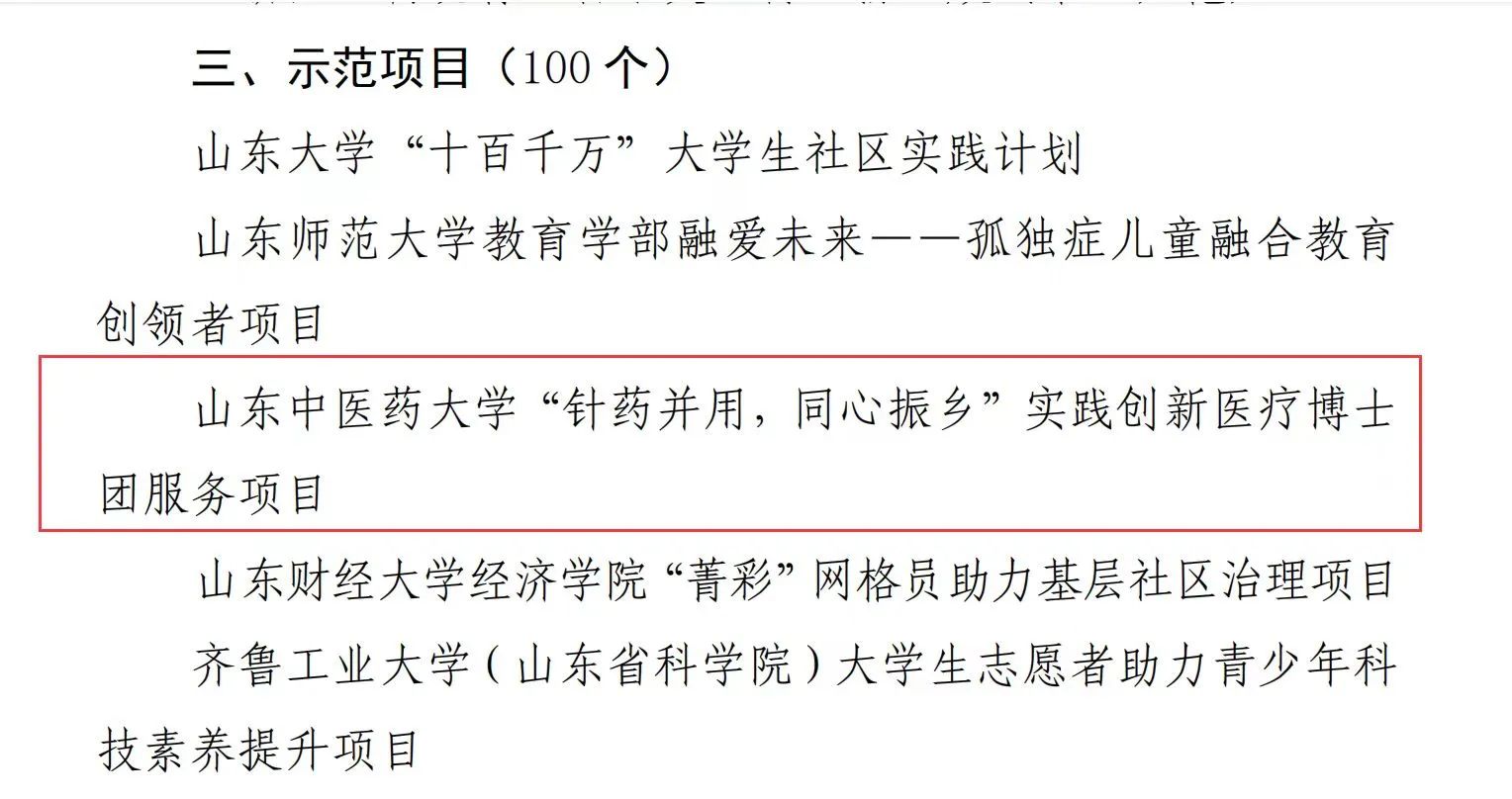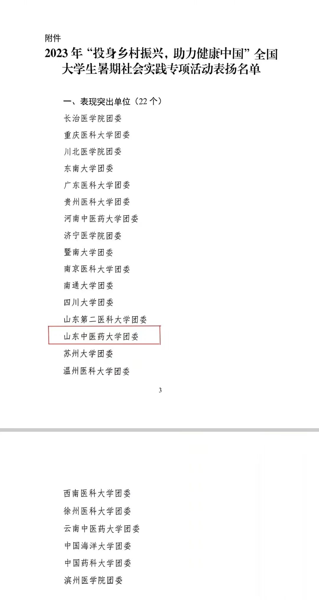 2024年2月29日,共青团山东省委办公室情况通报〔2024〕2号文件公布了2023年度“百万大学生进社区”社会实践活动表扬通报,韩国三级 “针药并用,同心振乡”实践创新医疗博士服务团服务项目入选示范项目。该团队由韩国三级 院长、山东省名中医专家杨继国教授与山东省名中医专家刘源香教授两位专家牵头,几十位硕博士研究生及本科生组成。