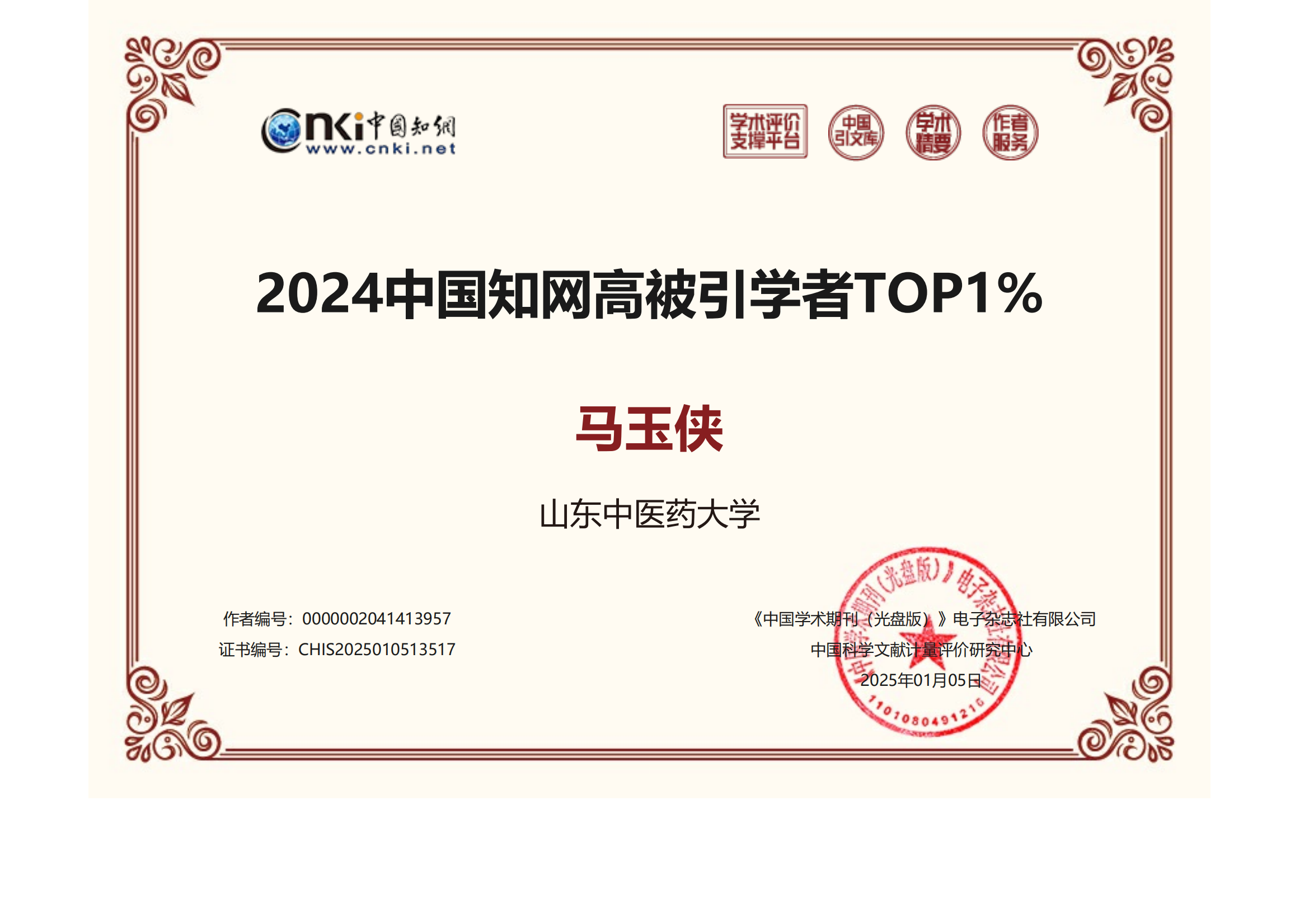 副院长马玉侠教授入选“2024中国知网高被引学者TOP1%”榜单。