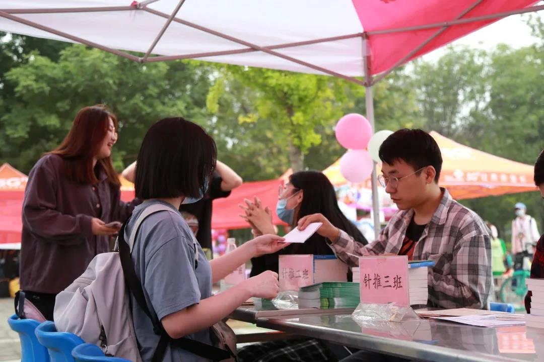 在机动人员的带领下,新生来到报道处。接待处工作人员帮助新生完成入学登记,然后指导新生从山中医的迎新系统扫描二维码进行签到,并把大学生心理健康手册、学生手册和防疫包领取券交给新生。报道完成后再由机动人员带领新生排队前往后接待处,一切工作井然有序。