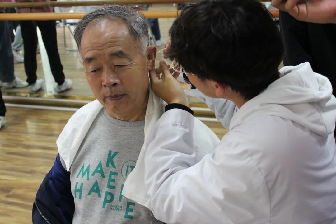 秋风虽凉,党团义诊服务队队员们仍然热情洋溢,通过悬挂横幅、口头讲解等方式,吸引社区老人前来体验。 在社区服务中心,服务队队员们尽职尽责,耐心询问社区老人们的症状,针对老人们常见的肩周炎、膝盖疼等病症,队员们采用拿法、弹拨法等推拿手法对其进行精准治疗。除了推拿治疗,队员们还认真地为社区老人提供了脉诊、测血压、耳豆压穴、针灸艾灸等一系列服务,赢得了老人们的一致好评。