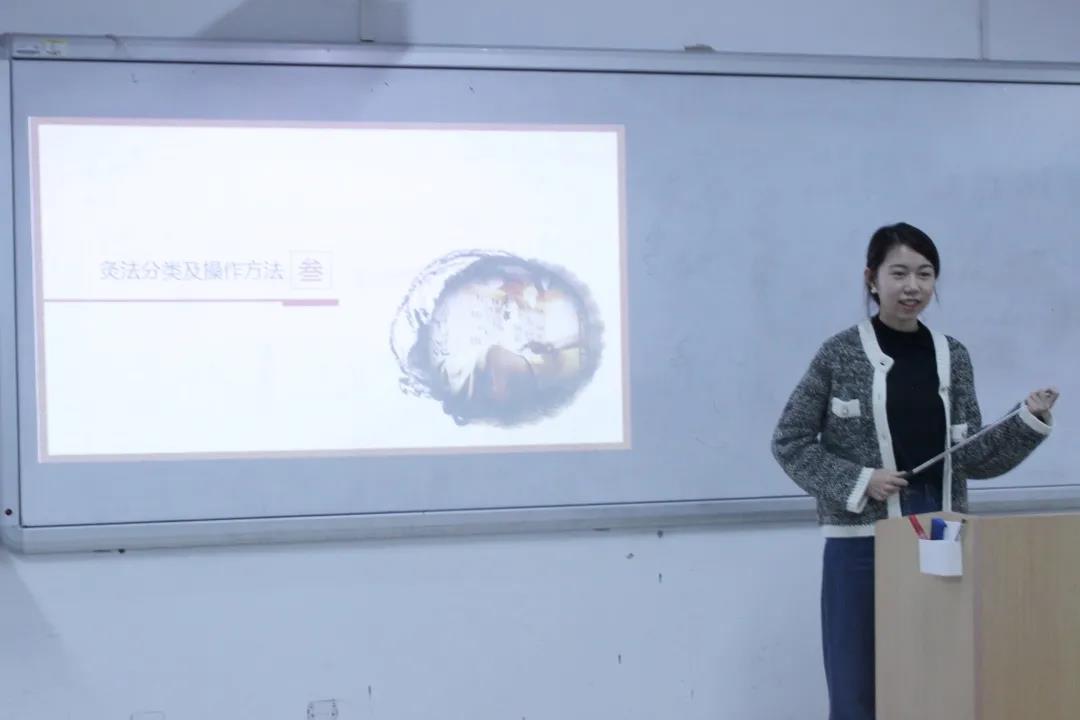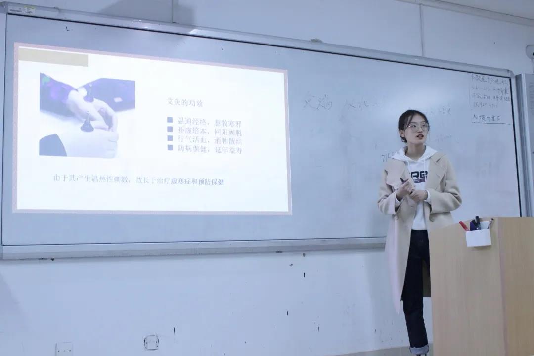 首先,贾静泊以“灸”的字形引入,浅谈了艾灸的历史及其与“火”的密切关系。接着,她拓展了艾草最早作为“灸焫”材料的知识,联系《内经》原文,带领同学们了解了施灸材料的类别、制作过程。此外,她也讲述了艾条的成分,帮助同学们加深理解。随后,她结合艾草的性状,向同学们讲述了艾灸的主要功用:“温通经络,驱散寒邪、补虚培本,回阳固脱、行气活血,消肿散结、防病保健,延年益寿”。艾草储藏时间的长短对疾病的治疗效果也有很大的影响。由于艾草里“有机物多,水少”,使得它具有“易燃”的特性。古语道:“七年之病,求三年之艾”,其实也告诉同学们,艾灸产生的温热性刺激长于治疗“虚寒证”与防病保健,因此对于久病、大病,需要寻找储藏3年的陈艾,才能达到“温和治疗”的效果。