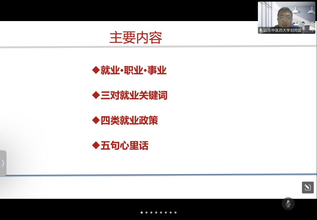 此次活动特邀招生就业处副处长兼大学生就业指导中心主任刘同国为毕业生讲座。讲堂上,刘同国老师首先指出,当下正值毕业季,毕业生就业进入关键时期,但面临疫情和社会各种形势的影响,如何解决现实存在的种种困难,成为了当务之急。由此,当下的大学生应打破对就业的固有认识,一方面提高自己的专业能力,以匹配职业;另一方面也要降低对自身过高的就业期望,脚踏实地务实事。