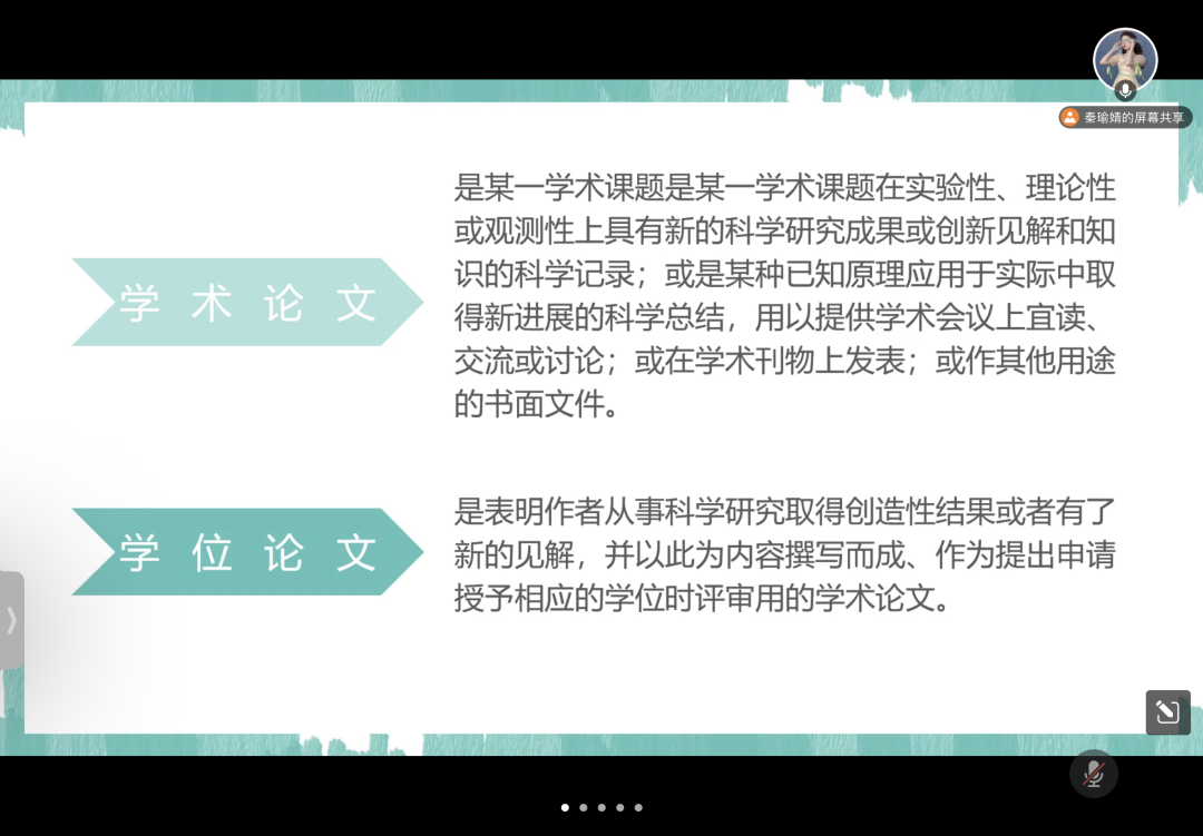 随后,秦瑜婧将构思论文与高效整理材料相结合,为同学们讲授了写论文的前期准备。她的讲解使同学们进一步了解了写论文的具体步骤,让同学们受益匪浅。