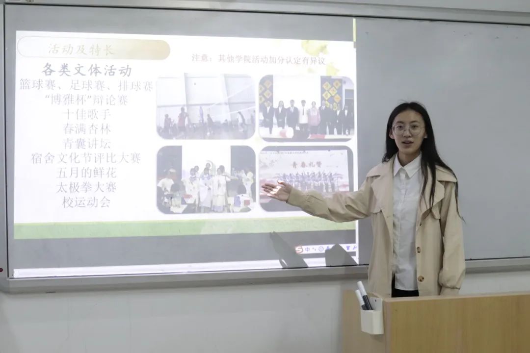 随后,赵镕婷为大家分析了综合素质分的组成,并就同学们如何提高自身的综评成绩的问题提供实用建议。她鼓励同学们参与“三下乡”“回乡看齐鲁”“针心灸行”社区服务等社会公益活动,这些活动不仅能丰富自我的社会阅历,更能提高自身综合素质,为成为一名合格的医生做好准备。