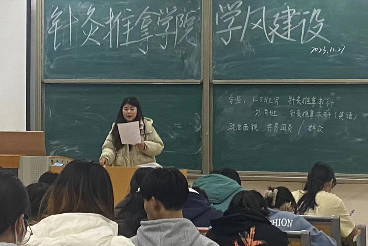 于32JT3、2106、1104等教室召开了学风建设讨论会,辅导员闫永洁、袁月松两位老师通报了近期课堂查课发现的问题,对同学们提出了更高的要求。两位老师强调,首先要端正学习态度,严格遵守课堂纪律;其次要树立自主学习意识,养成良好的学习习惯;最后,两位老师建议形成学习互助小组,班委和学习比较优秀的同学主动帮扶学习困难学生,发挥传帮带作用,共同营造浓厚的山中医针推学风。
