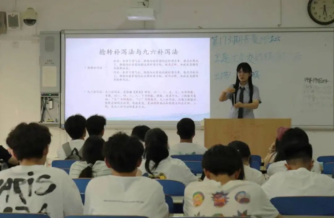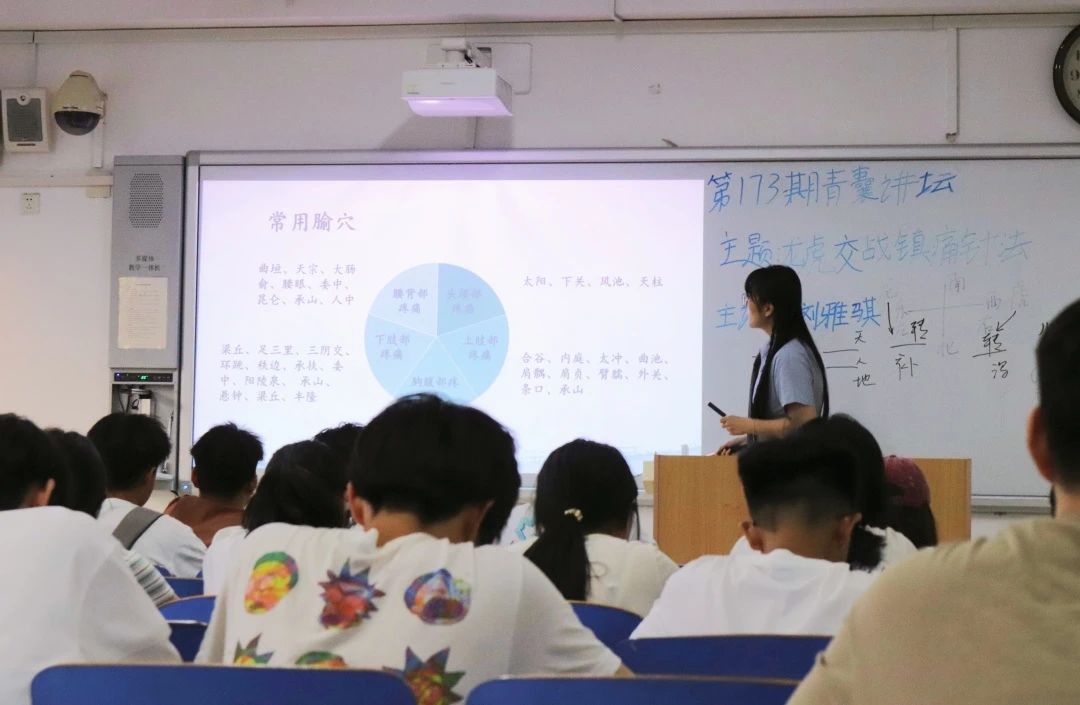 学生会学习部承办的第一百七十三期青囊讲坛在教室2408成功举办。本期青囊讲坛的主题为“龙虎交战镇痛针法”。2020级针灸推拿学本科02班的刘雅骐担任本次讲坛的主讲人。