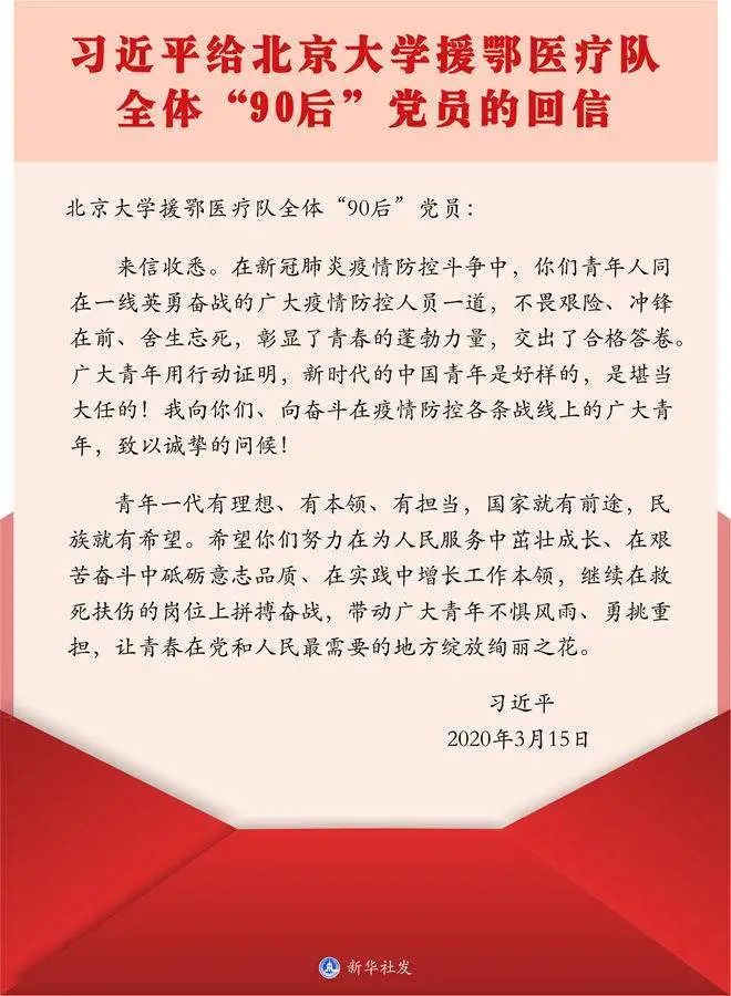 中共中央总书记、国家主席、中央军委主席习近平3月15日给北京大学援鄂医疗队全体“90后”党员回信,向他们和奋斗在疫情防控各条战线上的广大青年致以诚挚的问候。