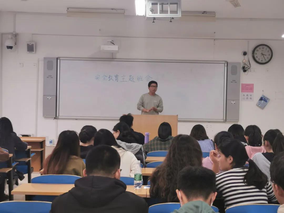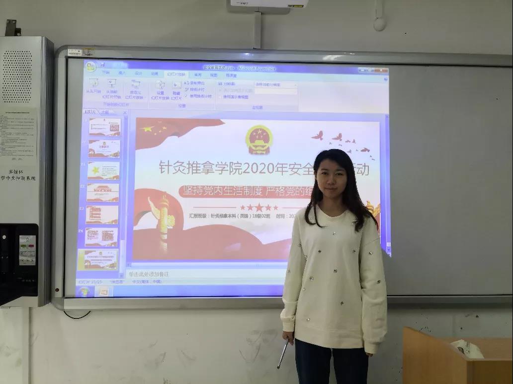 针灸推拿本科(英语)18级02班班委根据准备的PPT向大家介绍关于安全的问题,从国家安全、网络安全、消防安全、防盗窃安全、心理安全、人身安全等多方面来阐述,增强安全防卫知识的水平,增强自我保护意识。