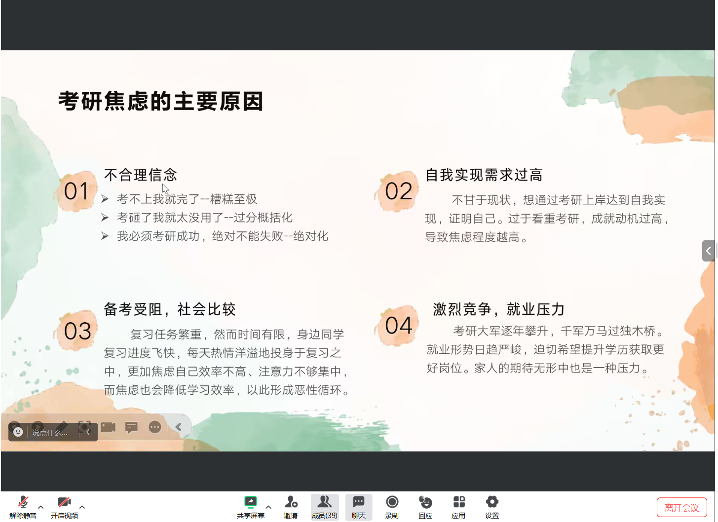 首先,闫老师为大家讲解何为考研焦虑。她讲到,考研焦虑是受个人的认知、评价、个性、特点等影响而产生的以对考研成败的担忧和情绪紧张为主要特征的心理反应状态。