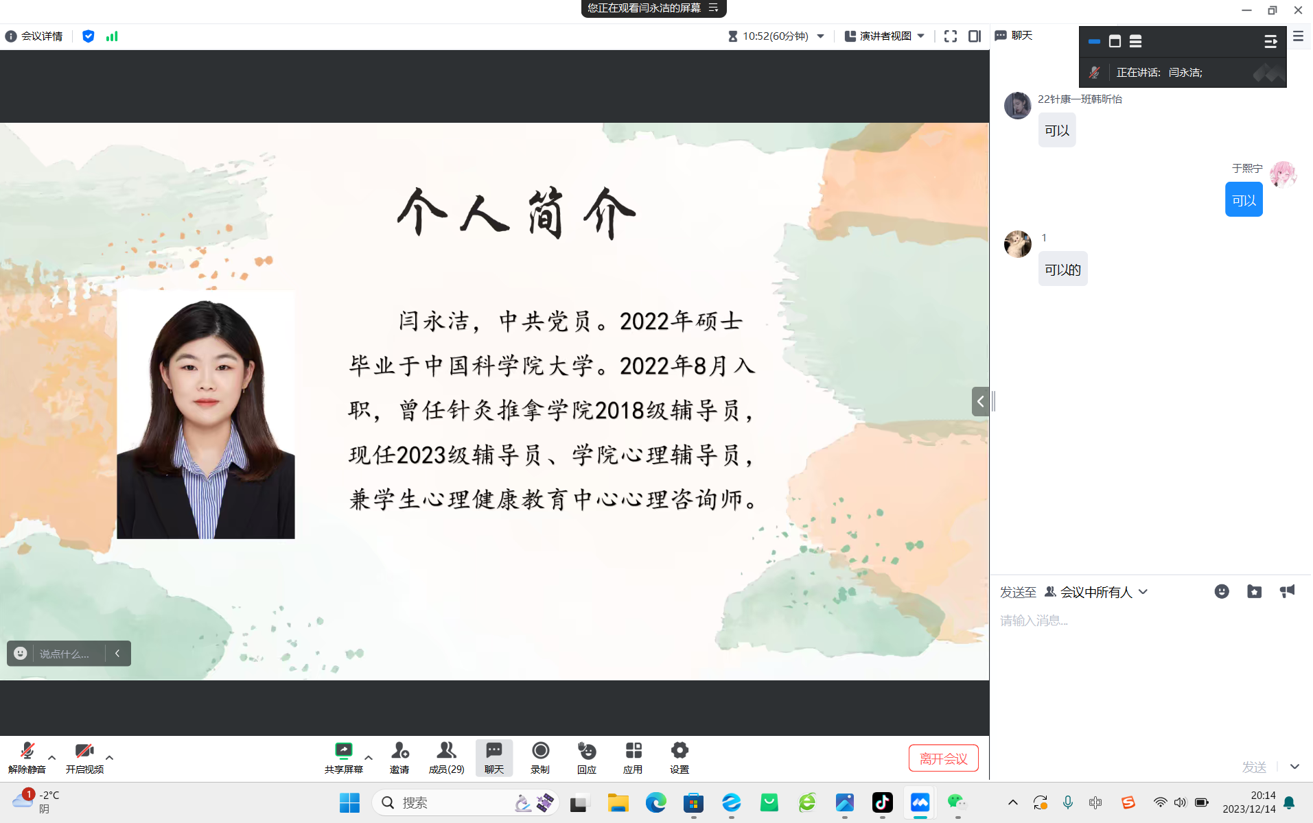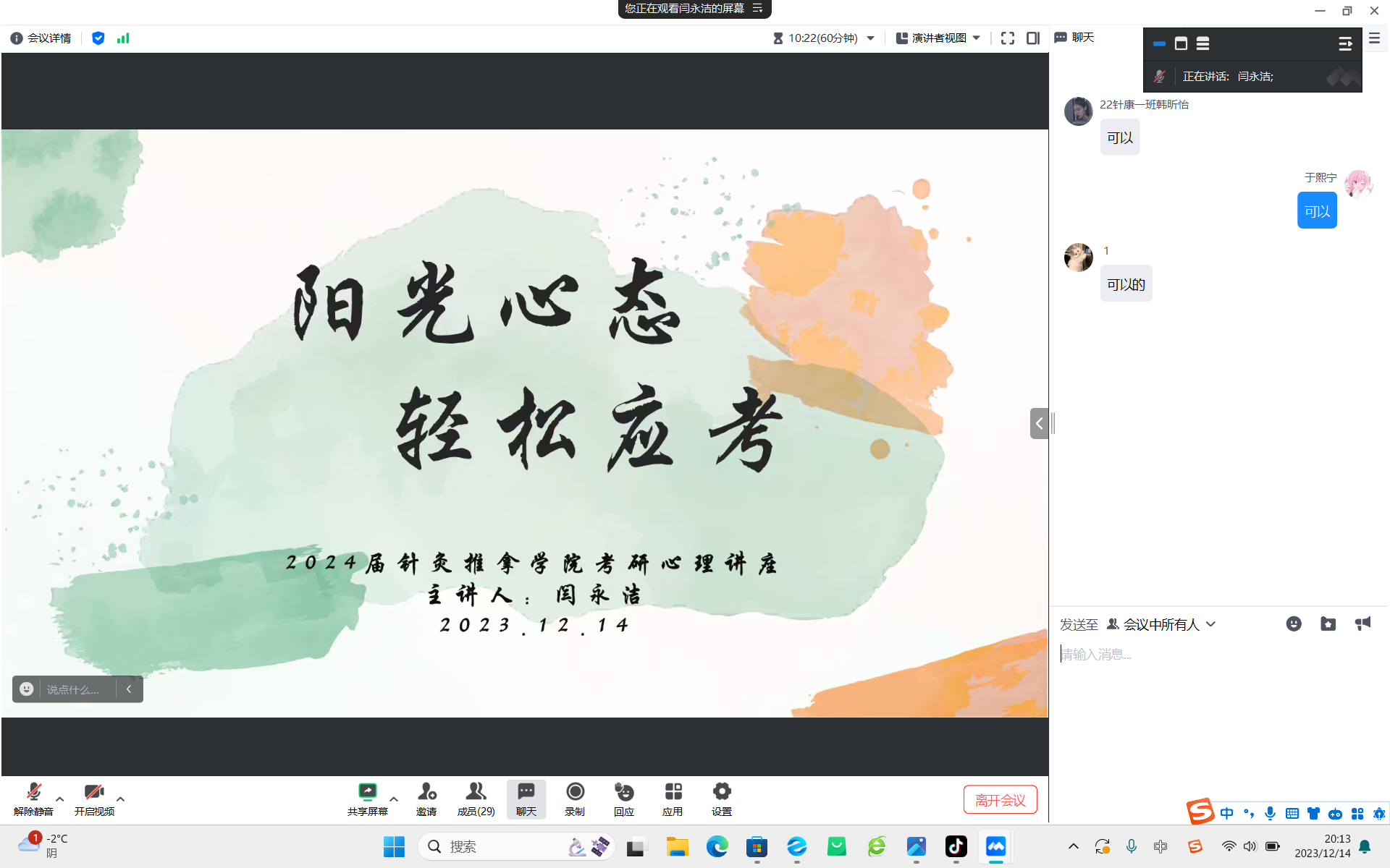 第九讲启迪讲堂邀请到闫永洁老师,通过腾讯视频会议为同学们做了考研焦虑心理调适相关的讲座。