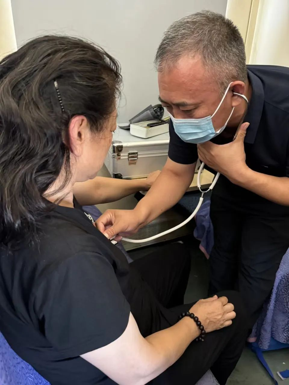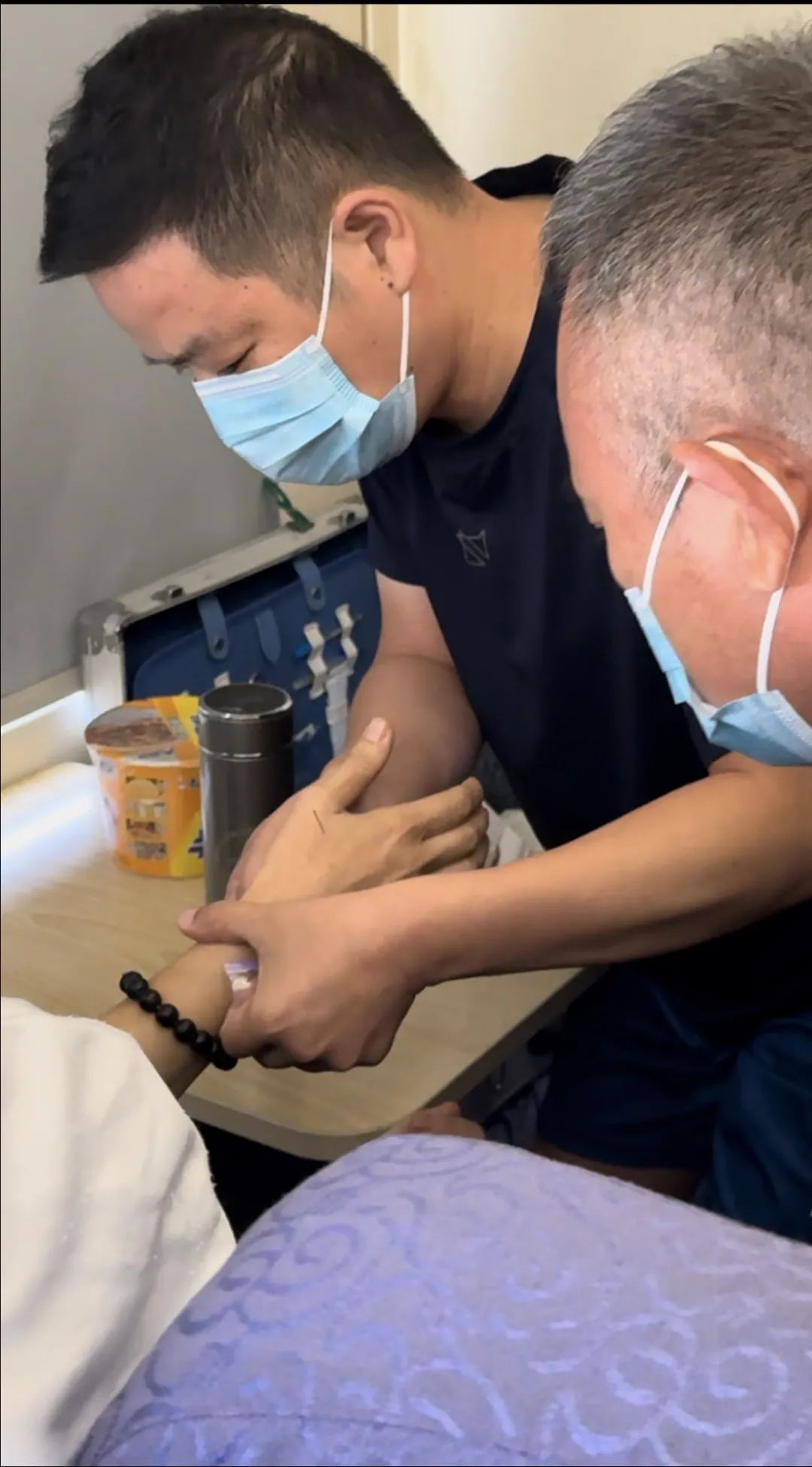 突发疾病旅客为一名50余岁的中年女性。此时正躺在列车上,面色苍白,冷汗淋漓,并有严重的胸痛、胸闷等症状,情况危急。何乃峰老师向病人同行人员详细了解她平素身体情况及用药后,经过舌诊、脉诊,初步诊断为气虚血瘀型胸痹,急需治疗。面对列车上相关药品短缺且新疆境内站间距离较远的不利情况,韩国三级