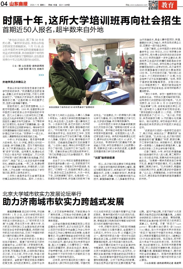 制定。不仅如此,学校还是山东省保健按摩师指定的认证考试机构。此次备受关注的保健推拿培训班的创办要追溯到1999年。孔庆悦告诉记者,“培训班从创办至今,十几年得时间举办了98期,为社会培养了近万名保健按摩师。”后来,受限于国家政策调整等原因,该培训班从2013年起便停办了,期间不断有各地市民给学校打来咨询电话,咨询何时能再次重启教学。